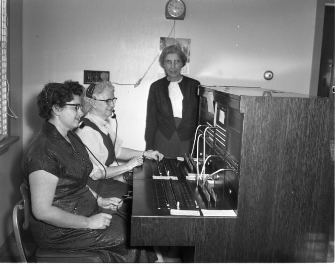 Pictured are the Tay Telephone System operators Mrs. Jack Todd, Mrs. Laura Belfry and Miss Eva Lidstone. Veteran personnel of the system includes Miss Eva Lidstone, chief operator, and William Grigg, linesman and general supervisor. Miss Lidstone has been employed steadily for the past 32 years. Other operators include Mrs. Jack Todd, Mrs. Laura Belfry, Miss Grace Kirkwood, and Cecil Profit, the night operator. Linesman Stan Robinson is Mr. Grigg’s chief assistant. Article on the same page discusses recent improvements to the system.