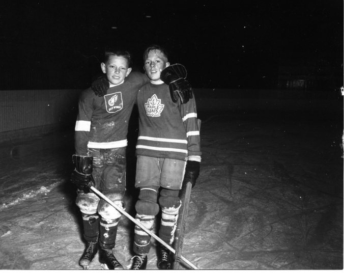 Good sportsmanship is a trademark of Midland’s Little NHL, here exemplified by Chester Graham, left, and Jon Pettersen. Jon scored three goals and assisted in another as his Rochester Americans beat Chester’s Hershey Bears 4-1 to win the AHL title at Arena Gardens Wednesday night.