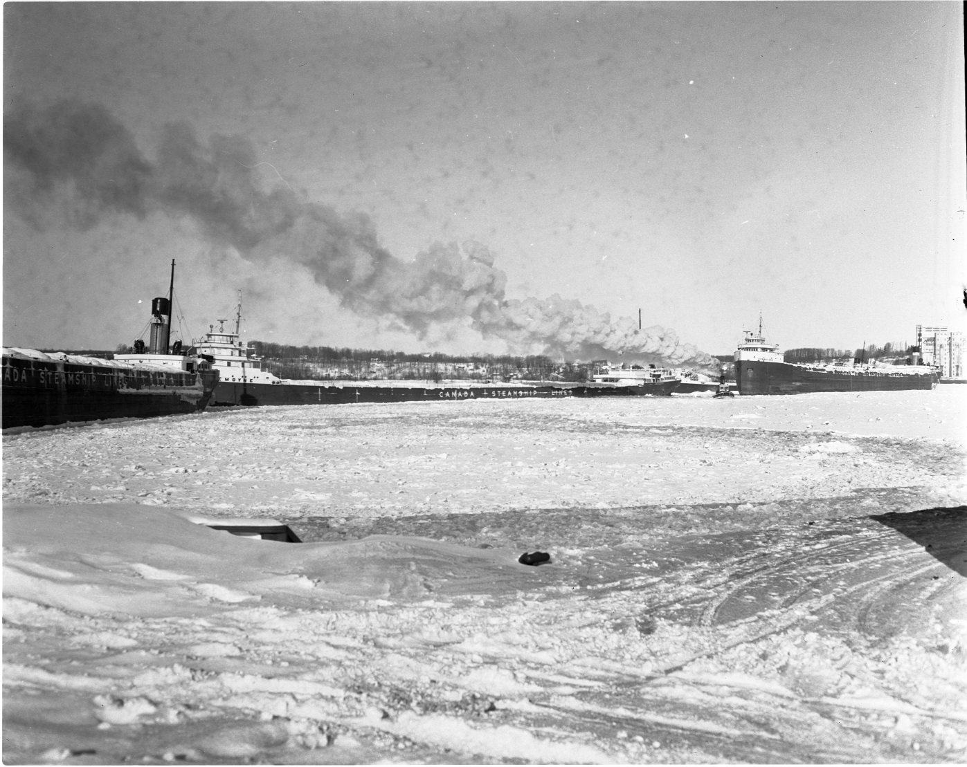 Moving the big grain carriers around in Midland harbor is a tricky job under the best of circumstances. When the harbor is jammed with ice, as above, the job becomes even more difficult. Here, the CSL’s Goderich, unloaded, is being moved away from the elevator to make room for the Lemoyne by the ice-breaker “Bayport.”