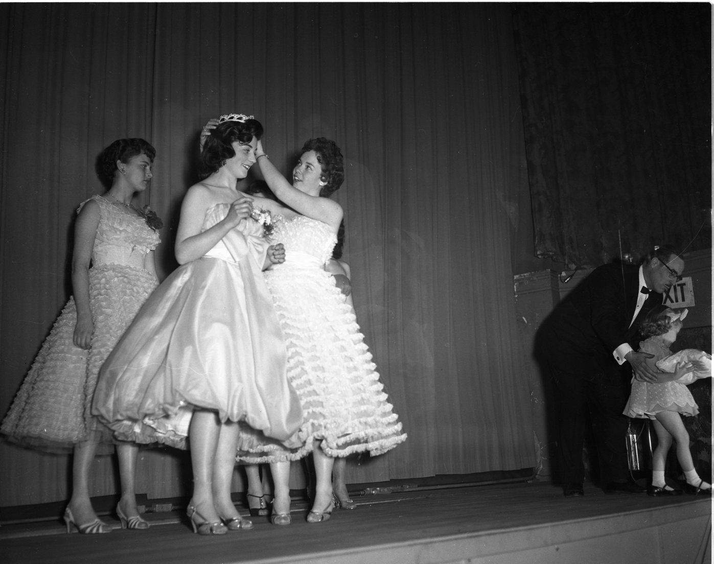 “I know just how you feel,” said Judy Mclntyre, as she crowned Gizele Bezner “Queen of Hearts” of MPDHS for 1959 at the Roxy Theatre Thursday night. Judy was last year’s “Queen”. The other contestant visible at the rear is Annette Ducaire of Penetang.