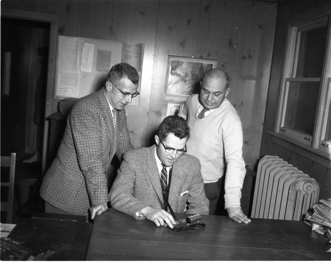 Reporters – Photographers Vern Farrow, left, Penetang, and Ken Somers, Midland, right, examine the trophy this newspaper won for best photo journalism in the Ontario Weekly Newspapers Association better newspaper competitions. General manager Robert Chittick, center, presented the trophy to the two men who take most of the pictures which appear in the Free Press Herald and County Herald.