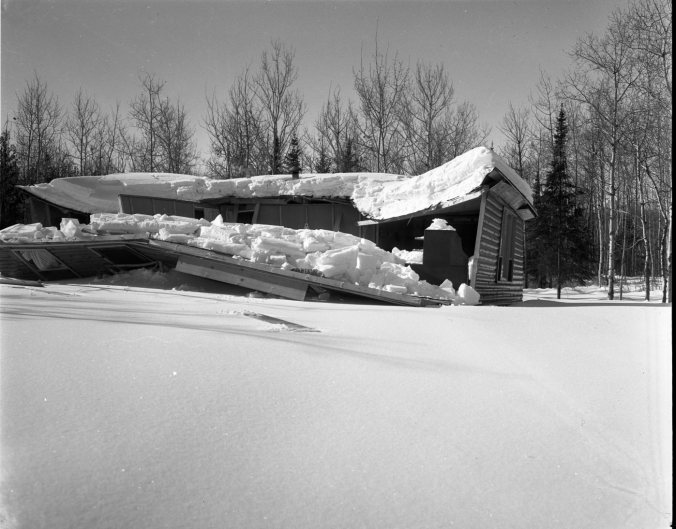 This cottage at Port McNicoll acquired several “rooms with a view” early Thursday morning when the entire front wall caved under the weight of more than four feet of snow on the roof. Owned by Mrs. R. Loveridge, Toronto, the cottage was less than three years old and is located on the Tay Township side of the road to Paradise Point. Workmen hastily cleared roofs of other cottages at Paradise and Grandview Beaches following this mishap.