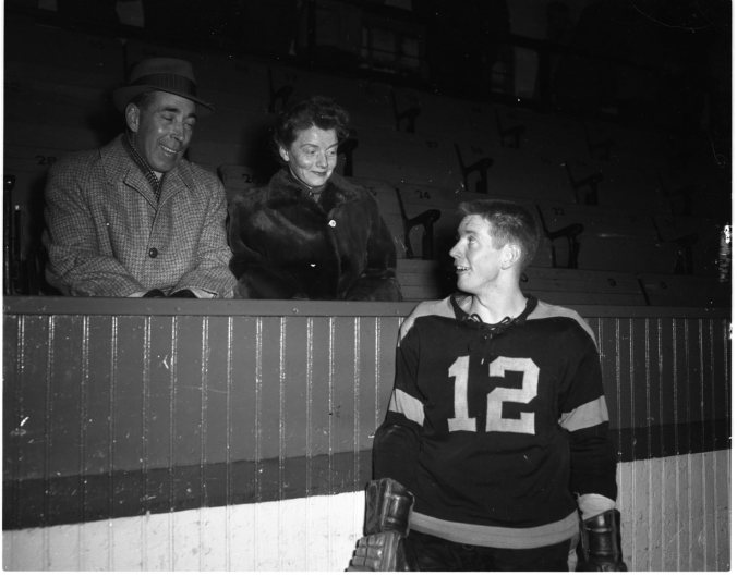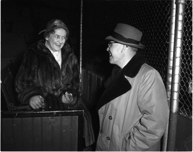 One of the most avid hockey fans in Midland, Miss J. Carson, a teacher at Regent Public School, didn’t pass up the chance to see Hamilton Cubs and Barrie Flyers meet in an exhibition game in Midland Tuesday night. Here she chats with an old friend, coach “Hap” Emms of the Flyers.
