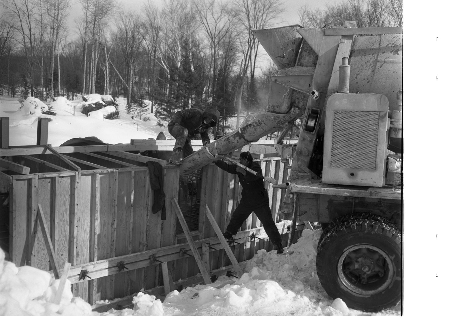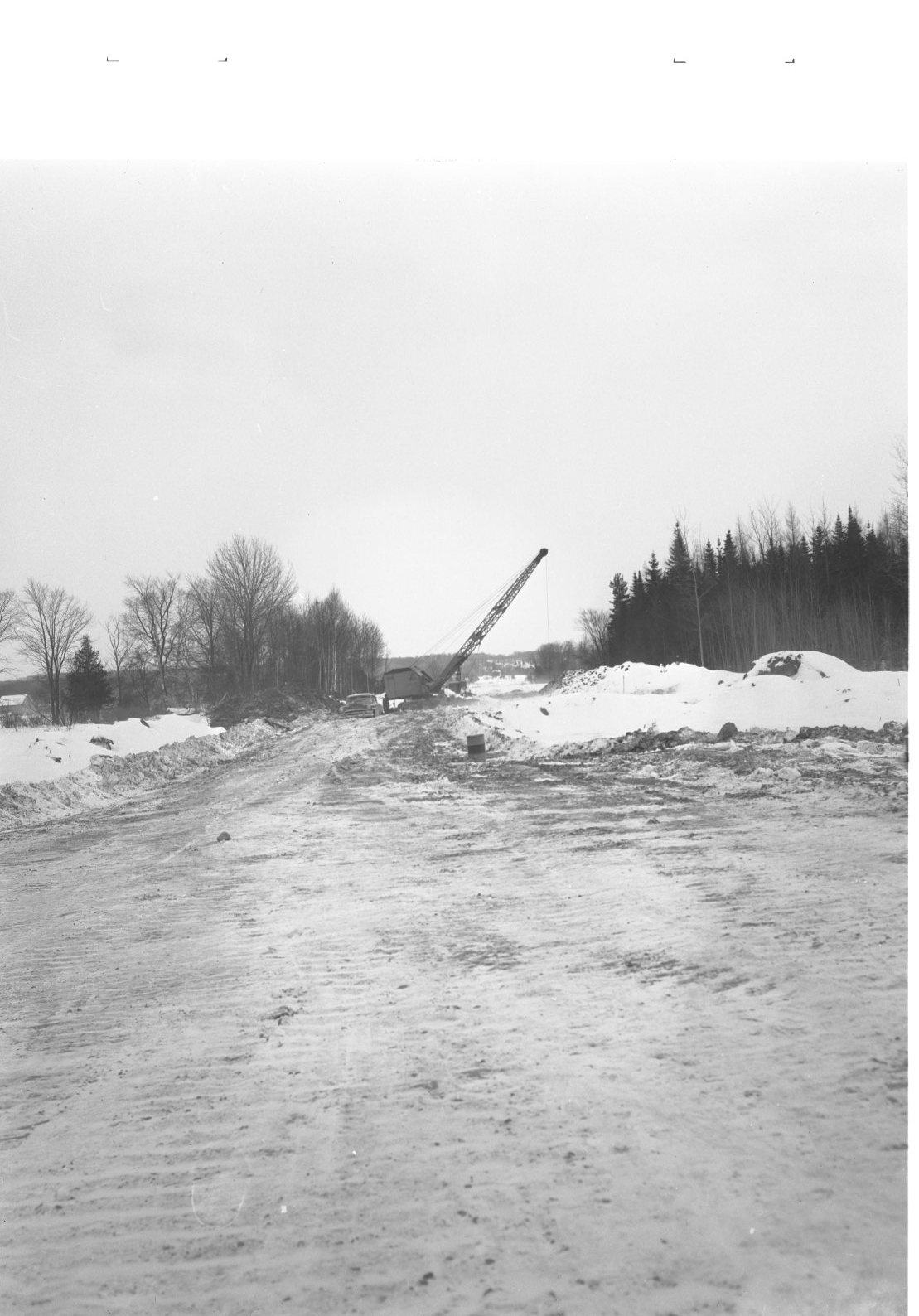 North Simcoe is tired of the long, cold winter but nobody, probably, is more so than the men engaged in outdoor construction and road work. Heavy snow and subzero temperatures have been the steady diet of the men working on the branch of the Trans-Canada Highway east of Coldwater. Top is a portion of the road stretching towards the Medonte hills, with the new bridge over the Coldwater River in the foreground. Lower photo, a big truck pours cement for a foundation of the bridge, despite temperatures many degrees below freezing.