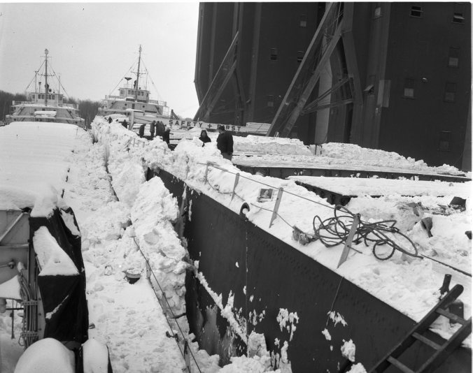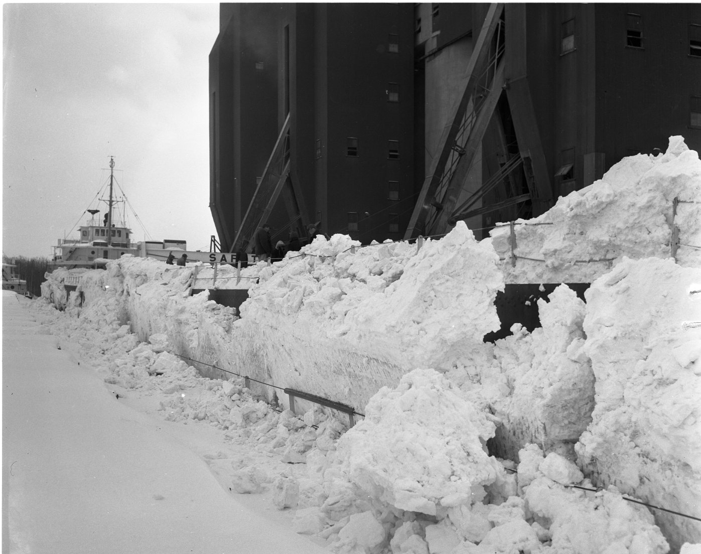 Giant squeeze play between CSL freighter Sir James Dunn and the Thunder Bay resulted in some odd snow formations at Tiffin elevator, Midland. Snow packed as hard as ice was forced up between the ships when one was lightened of its winter storage cargo. The same thing happened on the other side of the ship, between it and the dockside.