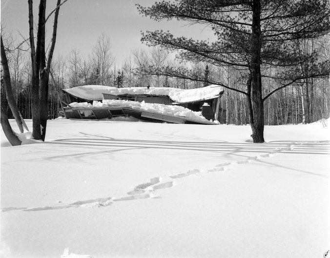 The walls come out and the roof drops in. That’s what happens when the snow load on a summer cottage roof gets too heavy. Cottage owned by Harold Collins, Toronto, and fronts on the main road between Balm and Cawaja Beaches. It was built only about a year ago and contains a considerable amount of furniture.