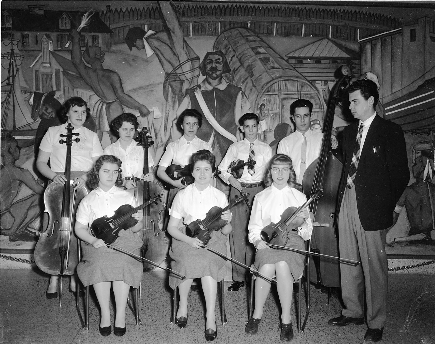 This string ensemble brought honour to Midland-Penetang District High School this week by placing first in its class at the Kiwanis music festival in Toronto. Seen with their director, W. A. Bartlett, are, left to right, seated, Marion Miller, Catherine McAllister, Karen Blair; standing Elizabeth Holt, Lois Cowan, Ellen Barber, Lloyd Preston, and George Haskill. Also a member of the group, Robin Benson was not present when the picture was taken.