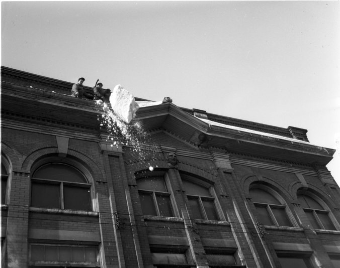 The cry here is not “Timber!” but it still paid to be alert as workmen dislodged this huge chunk of snow from the coping of a Midland store, high above the sidewalk. The sidewalk was blocked off while the dangerous but necessary job was carried out. (This building, known as the opera house, would be completely destroyed by fire exactly one year from the date of this article; the People’s Store fire.)