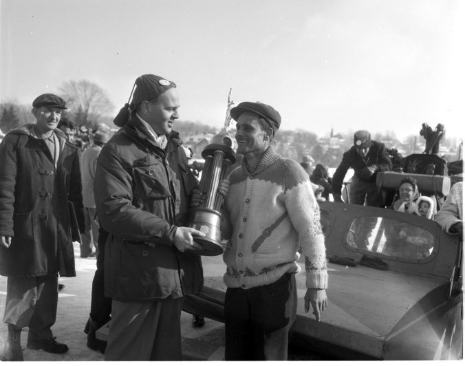 Winner of the open and l00 hp and over classes in scoot races at the Winterama Sunday, Leo King of Go Home Bay receives the world championship trophy from Cliff Bower.