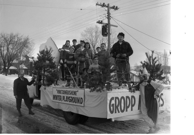 Awarded the trophy for the best float in the parade, at the Penetang Winterama Saturday and Sunday, was this entry of Gropp Motors. The boys and girls on the float depict the various winter sports in the Penetang area.