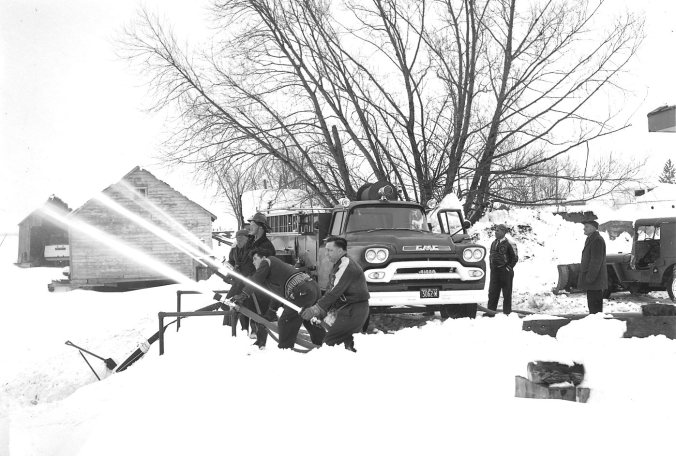 It was a good job the Waubaushene fire brigade didn’t really have to fight a fire when its members tried out their new fire engine at the government dock Friday afternoon. They had to cut through 48 inches of ice beside the dock to get the water to test this new piece of equipment. Once the engine did get some water to work with the new truck “completely satisfied” Fire Chief Joseph Moreau, several members of the brigade, and Tay Township officials. A few minutes later, Reeve Fred Kinnear had no hesitation in accepting the keys from Murray Holland, sales representative of King Seagrave Ltd. of Woodstock, makers of the truck. Mr. Kinnear, in turn, presented the keys to Chief Moreau. Completely equipped and costing approximately $17,000, the truck was purchased by Tay Township in an effort to provide better service for ratepayers in the northeastern portion of the township. It will be stored and operated by the Waubaushene volunteer brigade, which will also keep-in-shape the old model purchased from the City of Toronto years ago.