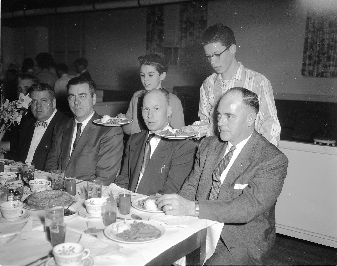 Every year Port McNicoll Public School holds a unique “father and son” banquet, where the sons actually prepare and serve the food. From Grades 7 and 8, the boys are instructed by Mrs. Mary Moriarty. Dads in the above picture are, left to right, Russel Coughlin, Elmer Callan, Bruce Duncan, and Ray Belanger. Boys are Danny Callan, left, and Bobby Duncan.