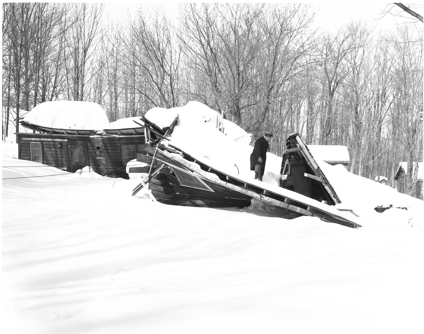 - Heavy snow loads are taking their toll of summer buildings in Tiny Township, according to reports received this week. Two large buildings in the area west of Penetang Bay collapsed Friday night. The one was a building approximately 110 by 75 feet at the summer resort owned by Phil Charlebois. A complete estimate of the loss is not yet known, although it will run into several thousand dollars. Used an a community hall for the occupants of more than 20 cottages, the building was almost a total wreck. About a dozen small boats, lawn furniture, and other items stored in the building are believed to be damaged considerably. The other large structure was the big dormitory of the Bayview Scout Camp, sometimes known as Camp Tap-a-Wingo. Substantial sums had been spent in renovating the building within the past few years, and it was only last year that installation of brick siding had been completed.