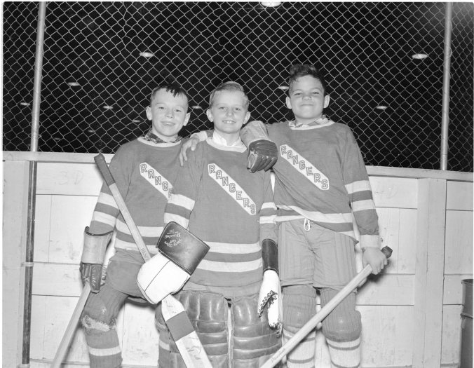 Happy trio of Penetang Little NHL pucksters won the playoff game for their “Guelph” team. Left to right, Don Tannahill scored twice; Ed Tugwell, goalie, kept the opposition down to three goals, and Patrick Quesnelle scored twice.