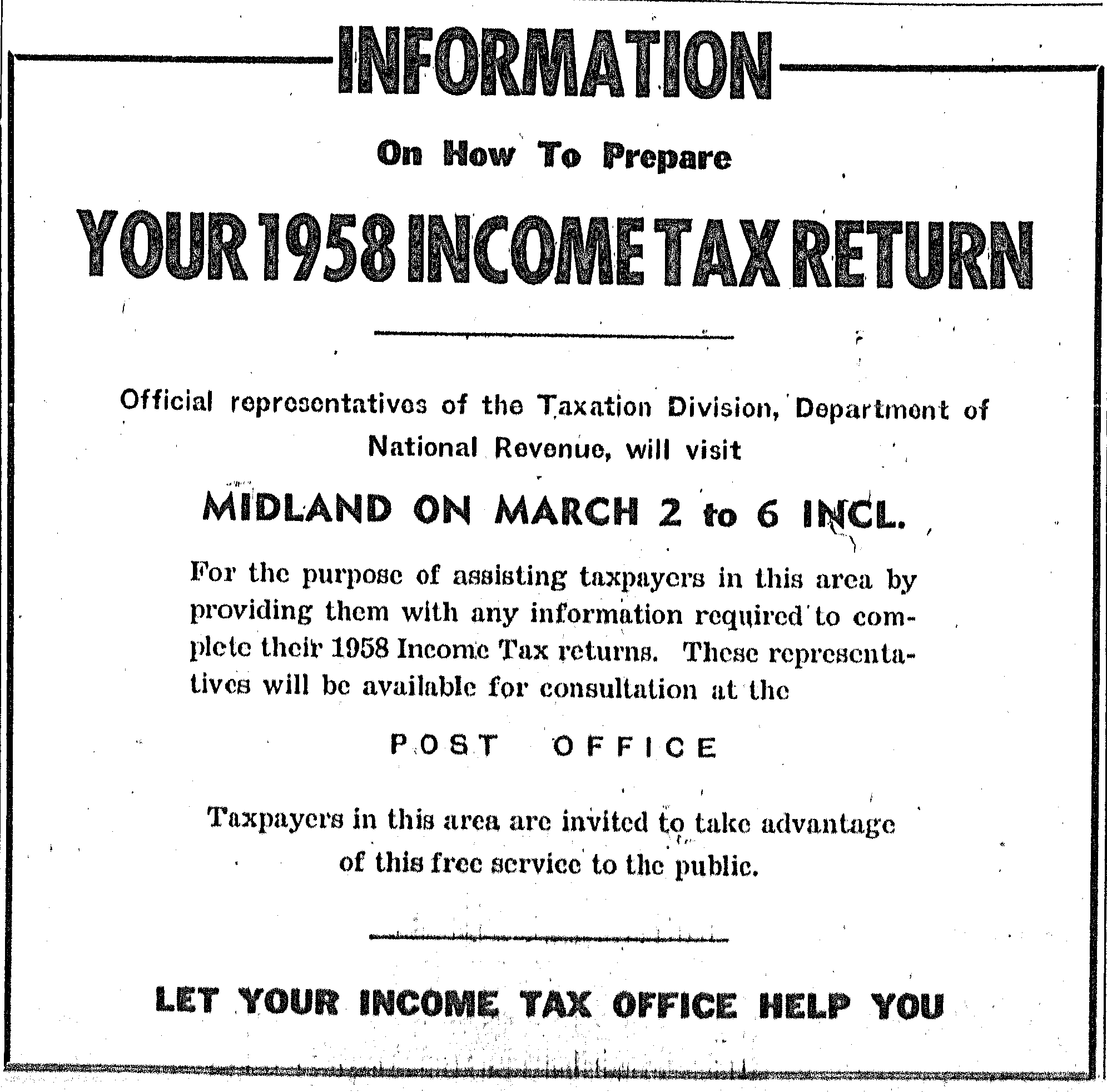 - The Midland Free Press headline of March 4th, 1959; 16-Month-Old Boy Dies in Isolated Baxter Home. Isolated in a Baxter Township home, three-and-a-half miles east of Highway 103, a 16-month-old boy died in the arms of his mother Friday evening before he could receive medical attention. Son of Mr. and Mrs. Thomas Cadeau, Archie David Cadeau had been ill with pneumonia. The roads were blocked by snow. His two-month-old sister, Diane, was rushed to Penetanguishene General Hospital suffering from the same illness after roads had been bulldozed Saturday. He said his son died in their three-room home while he and his father-in-law, Albert Leduc, 76, were hitching up a team of horses to take the child to a doctor. Just as they had finished putting the harness on the team, his wife said the baby had died. They have eight other children. Mr. Cadeau and his father-in-law then drove the team over the snow-clogged township road to the highway and from there to his brother’s home in Port Severn. He called Coroner R. F. Brown of Coldwater, who told him to bring the baby out. He returned home and he and his wife walked the seven miles back to Port Severn with the body of the child.