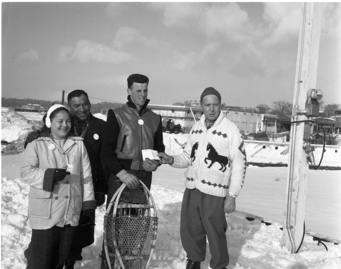 Winners of the snowshoe races staged at Penetang’s Winterama March 1 receive their prizes from Jaycee Eugene Bellehumeur, right, chairman of the snowshoe race committee. Right to left are Larry Jones, Midland, first in men’s; Tom Tobey, Honey Harbour, 2nd in men’s, and Angela King, Honey Harbour, 2nd in women’s. Betty Jones, Midland, winner of the women’s event, was absent when the photo was taken.