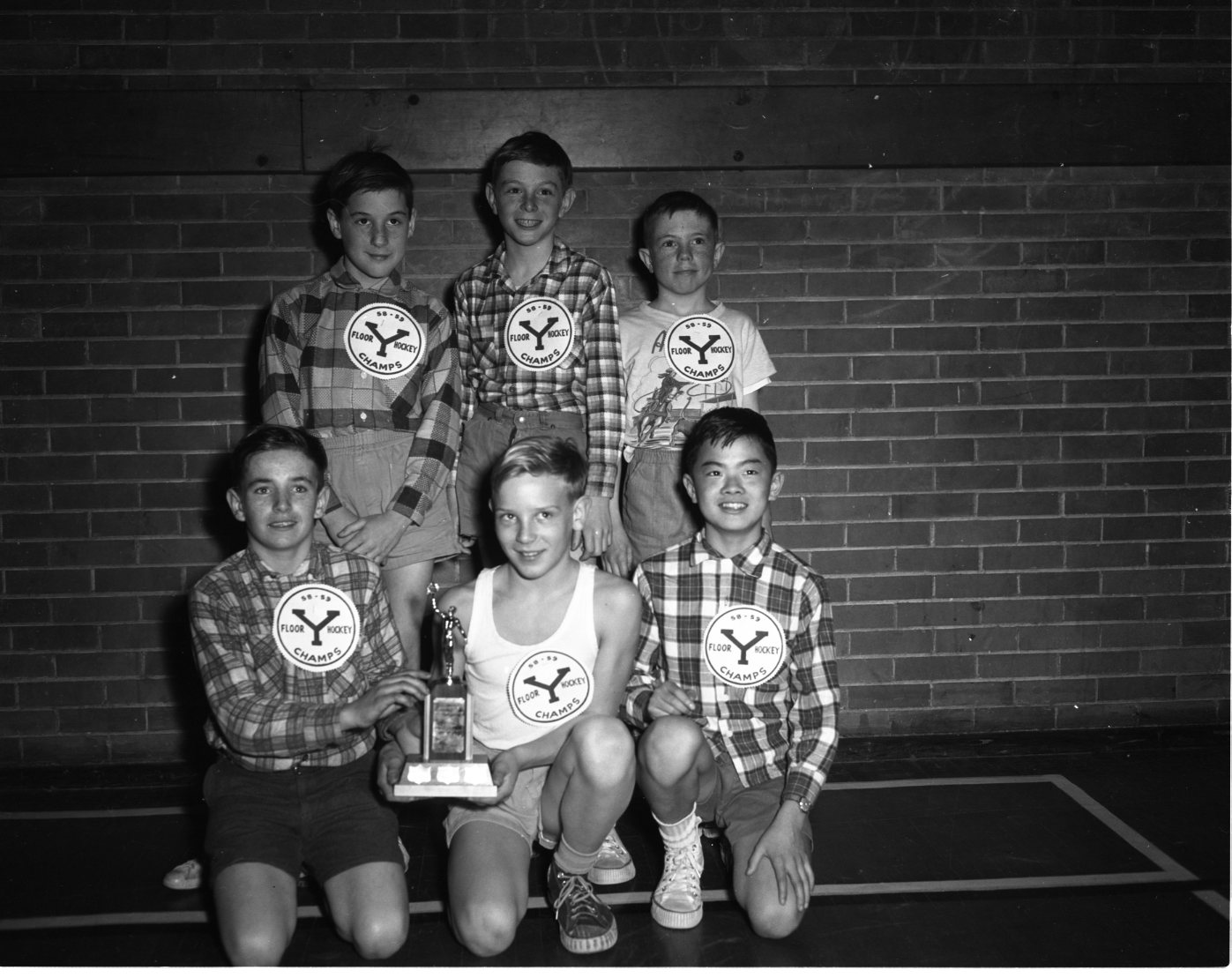 Floor hockey has long been one of the favorite sports for boys of Midland YMCA. In the lower photo are the Mustangs, this year’s winners. Left to right are; kneeling, Ronnie Jeannotte, Bob Weckman, Gene Suzuki; standing, Allan Cornell, Chris Lyons, and Frank McLean. Runners-up, Golden Eagles are Rafael Shushan and Jimmy Martin in front, and Paul Henderson, Ricky Howard, and Tom Fisher, rear.