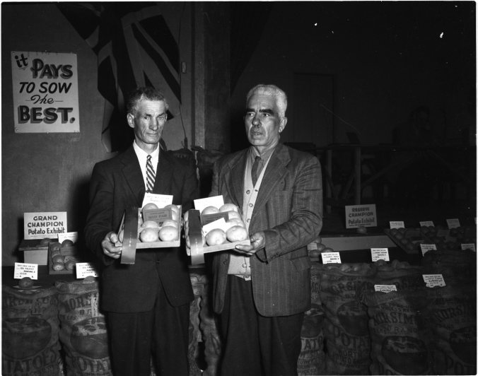 One of the main features at the annual North Simcoe seed fair at Elmvale has been the potato competition. Telesphóre Forget, left, is this year’s grand champion, with Ida Maurice as reserve champion. Both men are prominent seed potato growers from the Lafontaine area.