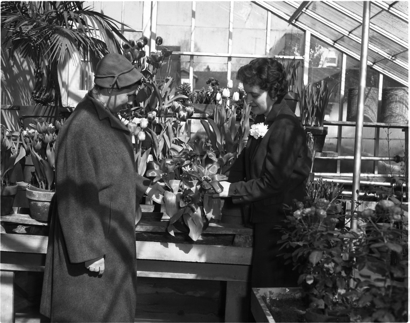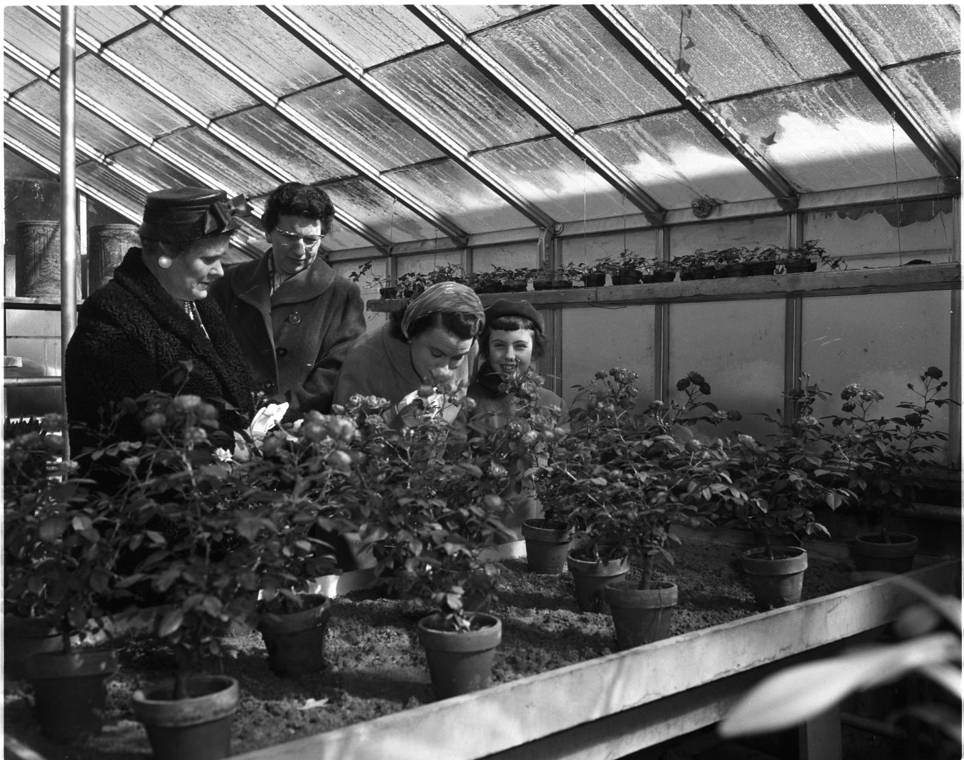 After this long hard winter, the flowers in Mac Perrin’s greenhouse were an even more welcome sight than usual during an open house sponsored by the Ladies’ Auxiliary of Midland YMCA Sunday. In the top picture Pat Cowden shows an eye-catching red emperor tulip to Mrs. E. Goldberg. Lower, Mrs. J. E. Lawlor couldn’t resist smelling the polyantha roses while Mrs. Charles Vent, Mrs. K. Huvers and her daughter, Debby Lawlor, await their turn.