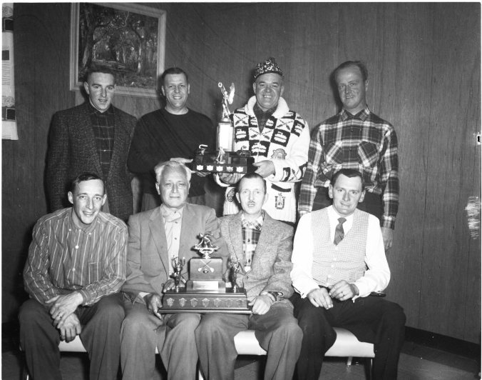 Winners of the Graham Swales competition, bottom row, were Jim Clark, Bill Kennedy, Bill Bourrie and skip Ossie Downer. Top rink, which included Murray Yorke, Cecil Merkley, Harold Wilcox, skip, and Dave Milner, won the Adams Trophy.