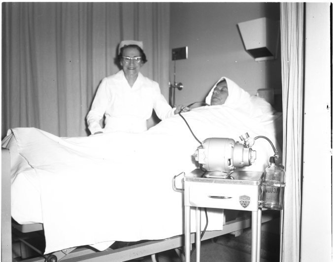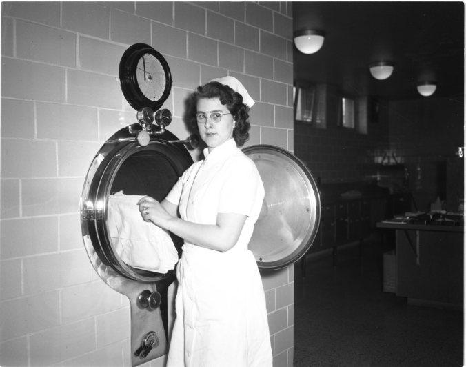Nursing assistant Kathryn McMillan demonstrates the use of the Gomco suction pump, right foreground. It was donated to St. Andrews by the Nurses’ Alumnae in 1958.