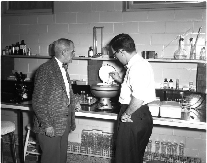 An important part of our hospital is the laboratory. Hospital accountant Clarence Day watches lab technician Ronald Hamelin make a blood test in the centrifuge.