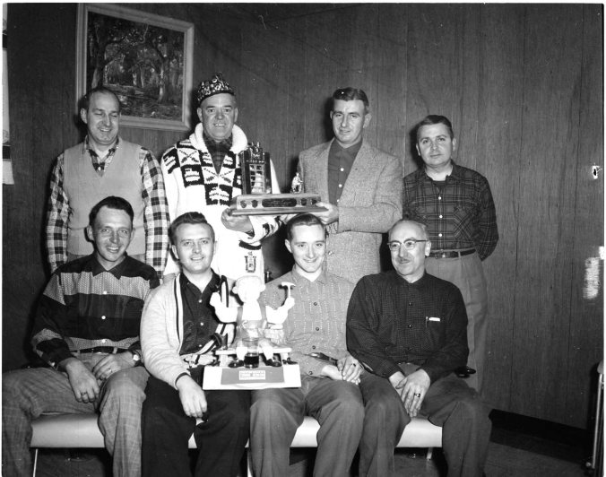 First event of the season, the “Early Bird” bonspiel, was won by Dave Milner, Aaron Shulman, skip Al Steer and Jim Clark, seated. Industrial League winners were, at rear, Murray Yorke, Les Barber, skip Armand Robillard and Jack Duggan.