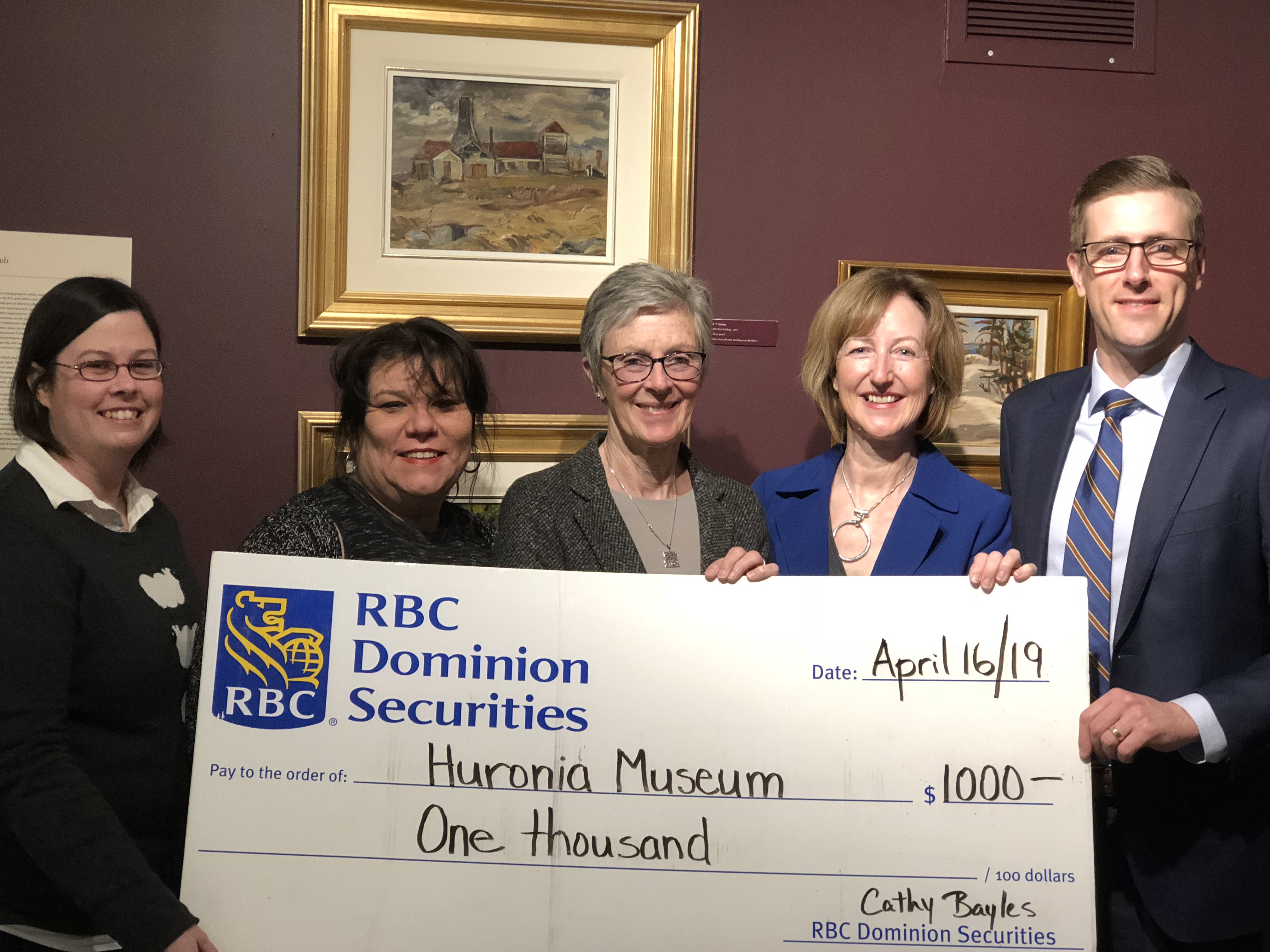 MIDLAND, ONTARIO – Cathy Bayles, Janet Walter and Paul Lauer from RBC Dominion Securities presented a cheque from the RBC Foundation to Huronia Museum on Tuesday, April 16, 2019 to support the ongoing efforts of the museum to bring educational programs to schools in North Simcoe.
