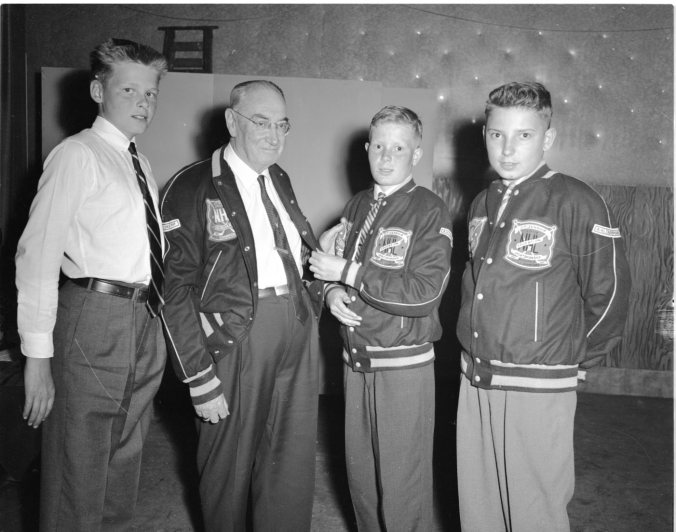 “It’s a bit too small around the waist,” admits Midland’s “Mr. Hockey”, George S. Dudley, as he tried on John Swan’s new jacket at the hockey banquet in Parkside Inn Monday. John, left, Dennis Abbott and Wayne Holden were presented with the jackets by the town for winning the Ontario AHL championship at Welland last month.