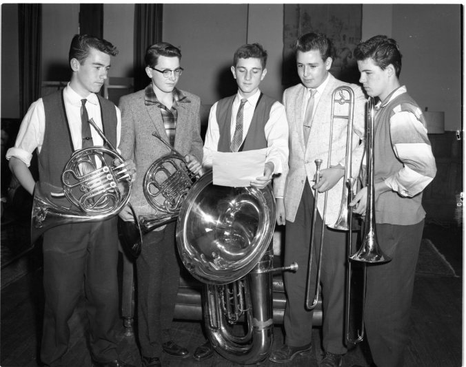 The music goes round and round at Midland Y’s Men’s Club’s 13th annual music festival, this week, and where it comes out is up to the judges. Several lads who took part in the instrumental competitions Monday study a score. Left to right are Neil Craig, Paul Davidson, Harry DeVries, Dave Bissette, and Jerry Hamilton.