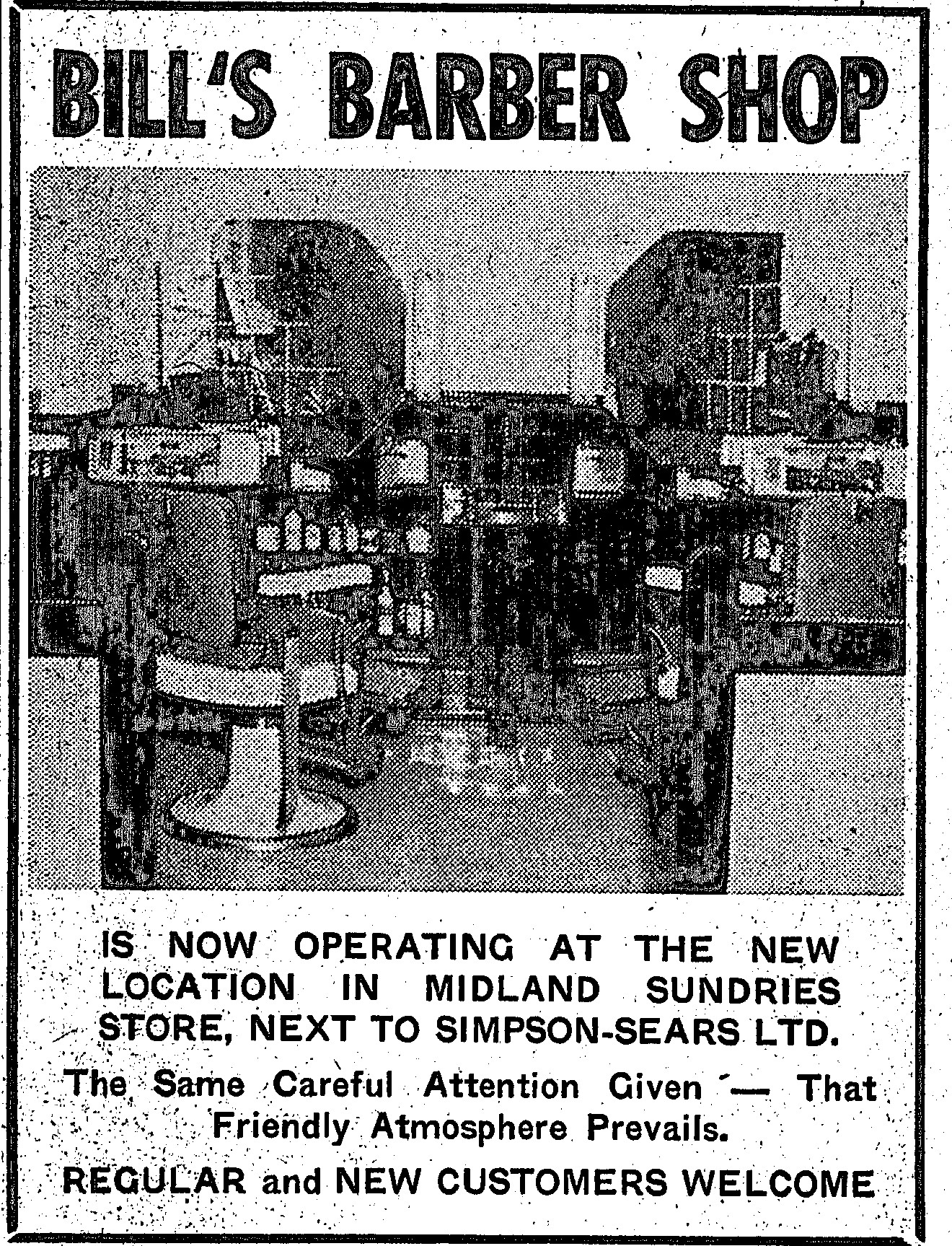 - After ten years in the same location on the east side of Midland’s King Street, Bill’s Barber Shop has recently opened in a new stand almost directly across the street, in the rear portion of the new Midland Sundries store. The new shop, operated by Bill and Eleanor Leitch, has been specially designed to take up as little room as possible but at the same time afford’ its customer’s even better service. There’s a place for everything and everything, is kept strictly in its place. The shop also features new ultra-violet ray sterilizing equipment, where clippers, shears, combs, razors and every item used on the customers are stored while not in use. The very latest of its type, the new sterilizer is the only one of its kind in use in this area. Another new item is the latest in lather service equipment which provides ready-mixed lather for all shaving needs, The new shop is also designed for easy and quick cleaning, with vinyl flooring and plastic tile walls. A barber for 15 years, Mr. Leitch was joined six years ago by his wife Eleanor. Theirs is the only husband-wife operation of its kind in the area so far as is known.
