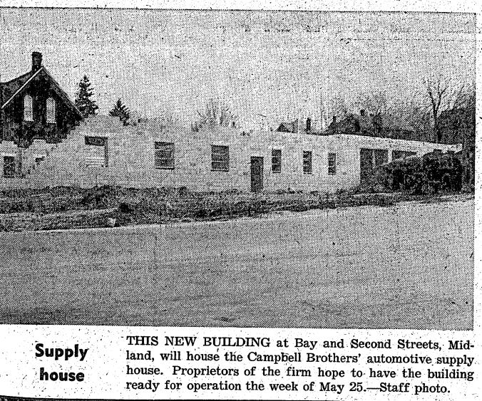 - Free Press Herald headline of May 6, 1959; Hardware Firm to Build $100,000 Building. Adding fuel to Midland’s current building boom, the erection of a brand new store, and warehouse for F. W. Jeffery and Sons Ltd, dealers in hardware in Midland for more than 60 years, was made official this week. The estimated cost of the new building, located at Dominion Ave. and First Street, one block west of the present location, is around $100,000. Nap Beauchamp Construction Company, Midland, is the contractor. Names of the successful sub-contractors have not been announced as of yet. The main store portion of the new building will be of one-storey cement block construction, measuring 50 by 100 feet. The warehouse, forming the foot of an “L” at the northwest corner, will be two storeys and will measure 40 by 20 feet. Weir-Cripps and Associates are the architects. The layout of the main store has been planned by the Versa-Flex Company; specialists in the hardware store field. Work got underway the last week of April on clearing a portion of the site of the ancient trees which have sheltered Dominion Ave. for generations. The warehouse is scheduled for completion May 31 and the main store by July 15. Also to be torn down to make way for the outdoor selling area and the parking lot is the old Ingram house, another Midland landmark for several decades. Work on tearing down the huge old home will not start until June. Founded sometime prior to 1900, the firm erected its own building at Dominion Ave. and King Street in 1901. In 1914 the present company of F. W. Jeffery and Sons Ltd., was founded. The sons were the late Edward Jeffery Sr., Todd Jeffery, and the late Fred Jeffery. In 1954 the building was sold to the Jeffery Holding and Development Co. Ltd. Actively heading the firm at present are Mrs. Hazel Jeffery as president and her two sons, William and Edward, as secretary and vice-president, respectively.