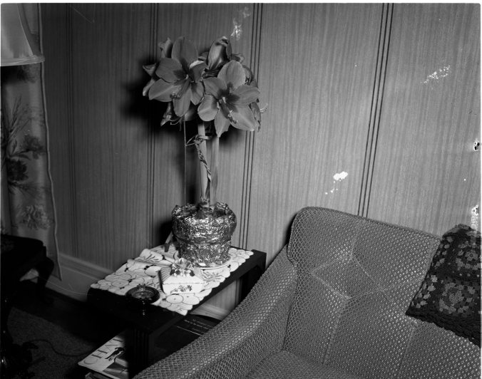 One of nature’s most eye-catching displays is provided by the amaryllis, a large lily-like bloom. The one above is owned by Mr. and Mrs. C. C. Jeffery, 360 Midland Ave., Midland. It has eight huge red and white blooms, each a good six inches in width, four on each of two stems. The stems, incidentally, grew almost an inch a day for three weeks. At one stage the Jefferys had relegated the plant to the cellar, fearing it would not bloom.