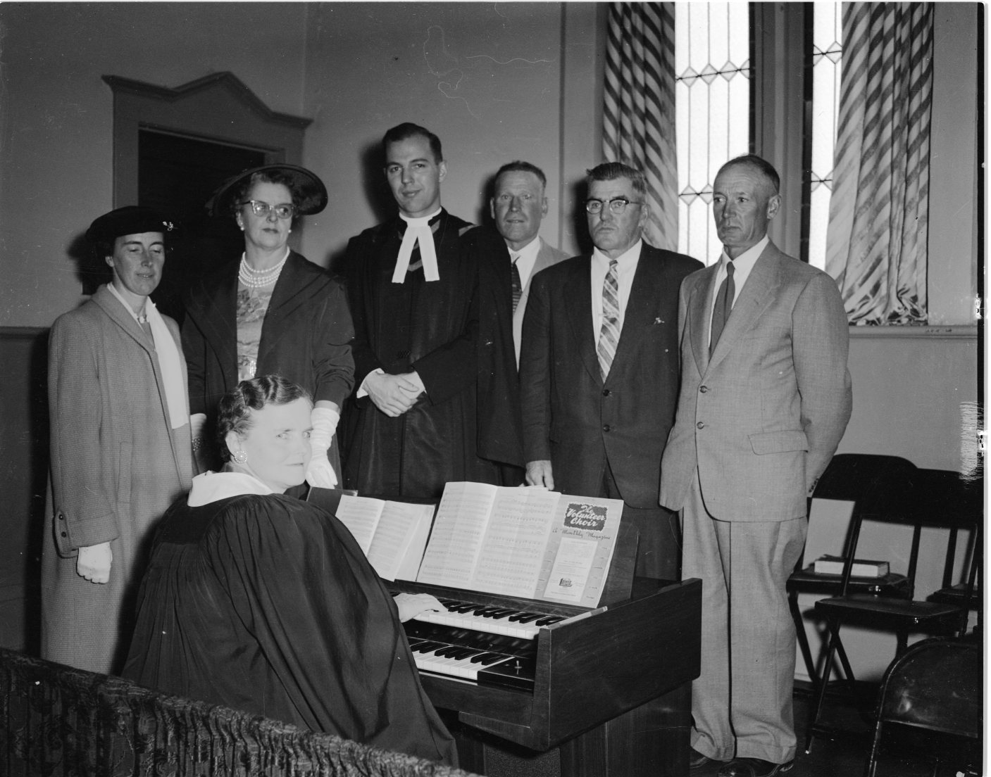 Sunday morning saw the dedication of this new organ and the 50th anniversary of the present church building, at Vasey United Church. Left to right, around assistant organist Mrs. Ross Faint, are Mrs. Horace Vasey, Mrs. Harold Cowden the regular organist, Rev. Gordon Nodwell, Ross Faint, Harvey Fallis and Frank Rumney. Two other members of the committee who helped raise funds for the $1,500 organ and who were not present for the picture were Mrs. Frank Rumney and Miss Eleanor Edwards.