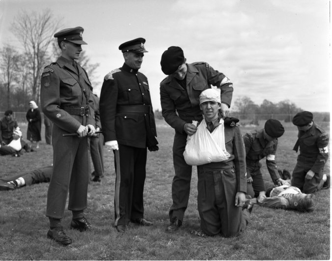 This cadet, Bill Laramey, was one of the better “casualties” on display during the first aid demonstration held as part of the MPDHS annual cadet inspection Thursday. Looking on while Grant Robinson completes his work are Cadet Lieut.-Col. K. MacEachern, left, and Lieut. Jim Downer, Grey and Simcoe Foresters, the inspecting officer of the day.