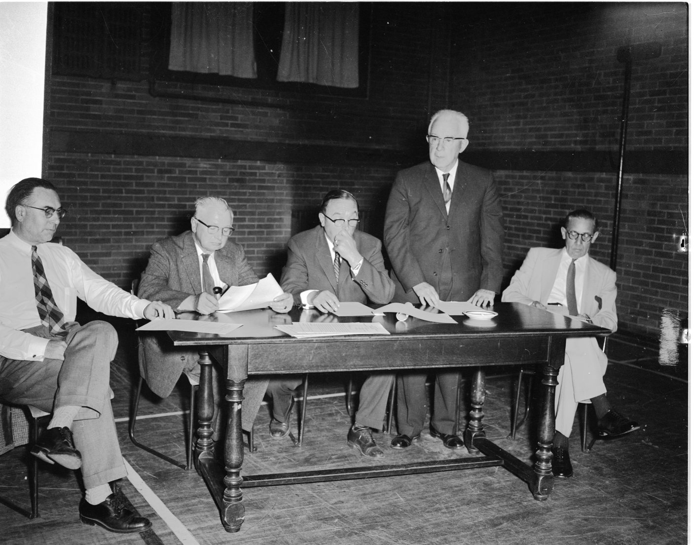 This panel discussion group was one of the features of the tourist trade conference in Midland YMCA Wednesday night under the sponsorship of Midland Chamber of Commerce. Left to right are R. B. Moffatt, chamber secretary-manager who acted as moderator; Wilfrid Jury, well-known archaeologist; Frank Dale, proprietor of a tourist resort at Ossosane Beach; V. G. Edwards, Vice-President of Edwards Specialty Shop; and Phil Robitaille, manager of Penetang’s Hotel Brule.