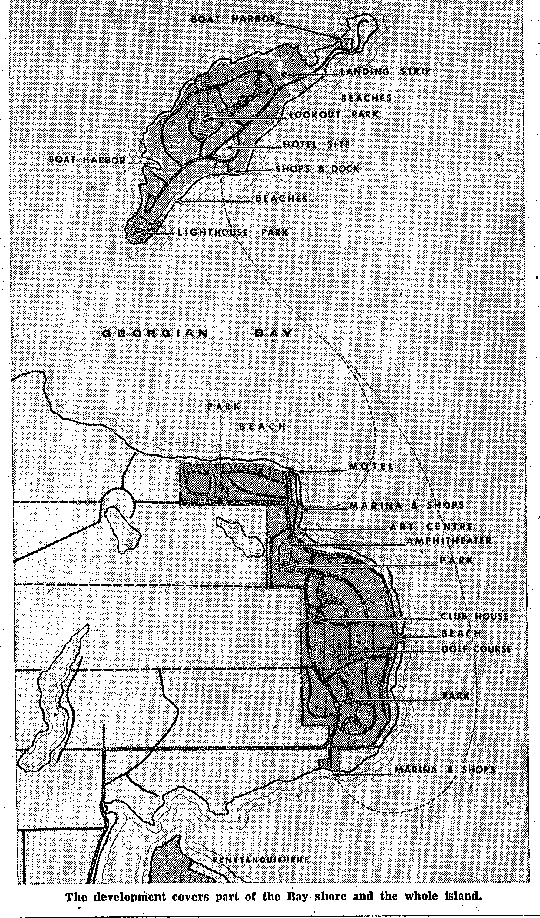 - A new summer playground is to be developed right on Penetang’s doorstep. Work will start almost immediately. The development is to provide some 3,000 acres of cottage sites, an 18-hole golf course, swimming pool, tennis courts and marina, and yachting facilities. The development lies on the south shore of Georgian Bay and includes the 1,200-acre Giant’s Tomb Island. It is being developed in conjunction with Miss Edna Breithaupt; sister of the former Lieutenant-Governor of Ontario and a patroness of the arts for almost half a century. In the centre of the project, she will maintain a 50-acre estate for the advancement of the arts in the tradition of the Wakunda Art and Community Centres of Canada which she founded in 1928. Some 5,000 cottage lots with maximum access to the waterfront and other facilities have been designed for the development, said Joseph Axler, of Axler and Palmer Ltd., exclusive real estate brokers for the project. The lots, a minimum of 100 by 150 feet, comply with all requirements of the Ontario Planning Act and will be, fully registered so that purchasers may obtain a proper deed. Inland lots will face on access parkways that lead to many community waterfronts averaging 400 feet to be shared by fewer than 40 families. Cottage manufacturers are assembling models of cottages on the site for public viewing sometime in the first two weeks of June.