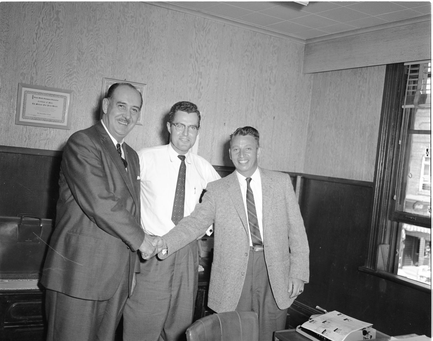 PC Candidate Lloyd Letherby, left, and Liberal candidate Jack Andre, right, met for the first time on Friday afternoon, May 22, in the office of J. R. Chittick (centre), general manager of the Free Press Herald, where they shook hands as a preliminary to campaigning for Simcoe East membership in the Ontario Legislature.