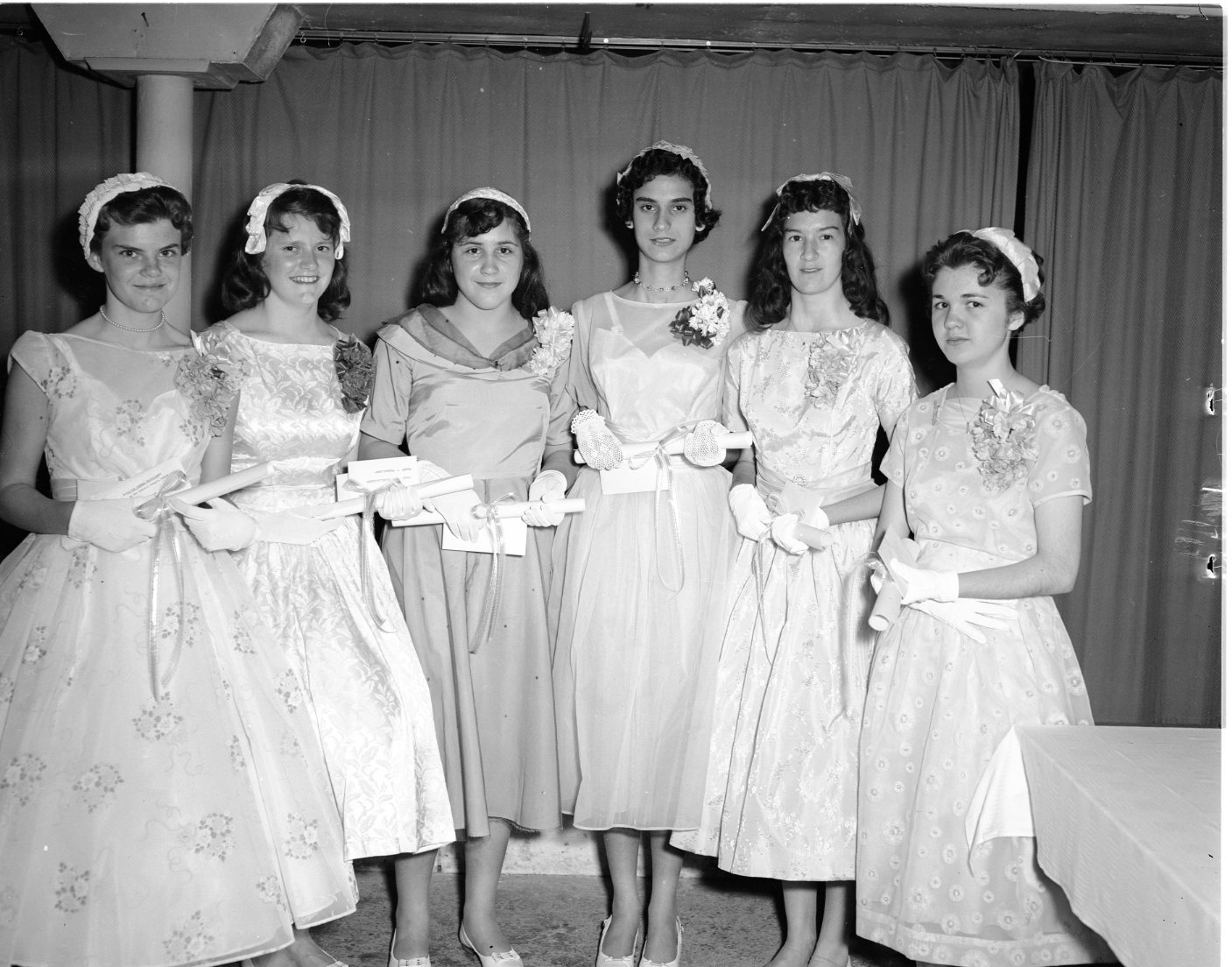 Thursday night was a happy occasion for these pupils of St. Mary’s Separate School, Victoria Harbour, as they received their Grade 10 graduation diplomas. Left to right are; Bryde Bernard, Margaret Cadeau, Audrey Somers, Mary Deschenes, Carol Roy and Celima Pelletier. Mary will attend MPDHS next year, Celima hopes to register for a business course, and Carol will work for the Bell Telephone Company in Midland. The other three girls will attend St. Theresa’s High School in Midland.