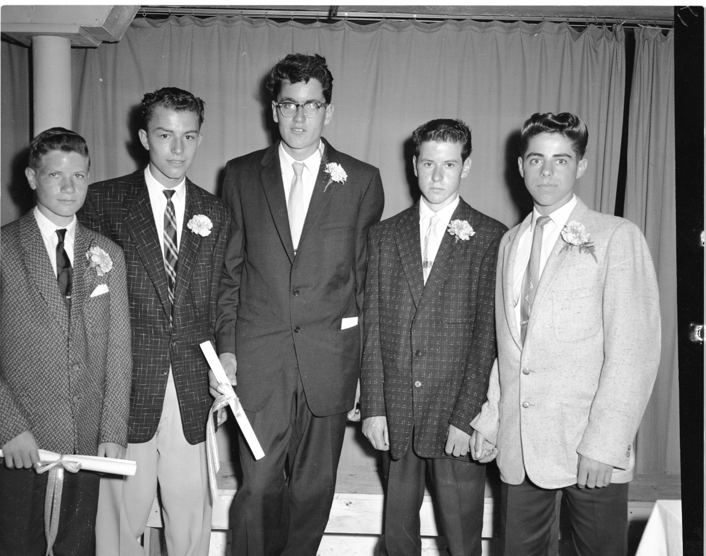 These five Victoria Harbour boys took another step forward in their scholastic careers when they received their grade 10 diplomas at St. Mary’s Separate School, Thursday. Left to right are; James LaChapelle, Brian Larmand, Willard Larmand, Bob LaChapelle and Pat St. Amand. Jim, Brian and Willard will attend St. Theresa’s High School, Midland, next term.