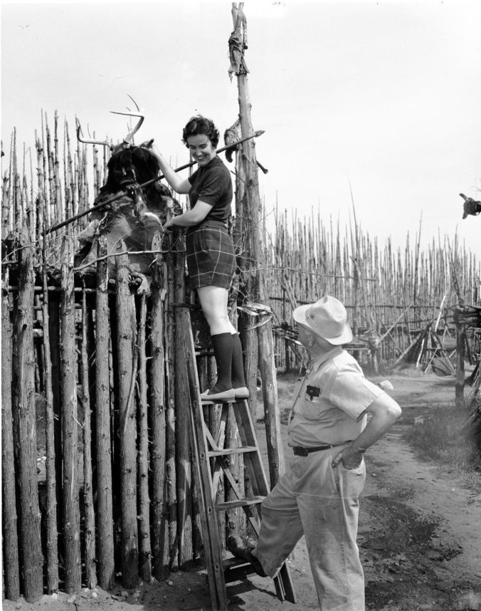 Click on photos to enlargeGrouchy-looking old Indian medicine man seemingly holds no terrors for pretty Western University co-ed Dawn Phibbs of St. Thomas, as she gets him ready for another big season at Midland’s Huron Indian village. Supposed to be holding the ladder is Dr. Wilfrid Jury, supervisor of the village and noted archaeologist.