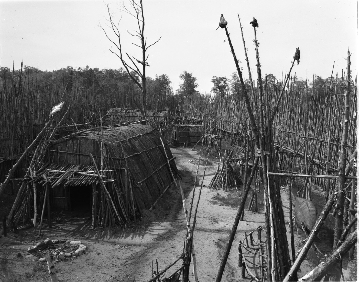 Each year the compound behind the palisades of Midland’s Huron Indian village at Little Lake Park gets more and more crowded as new and authentic pieces of every-day Indian life more than 300 years ago are added. This picture was taken from new look-out erected this year at the south end of the village. It makes an excellent camera vantage point.