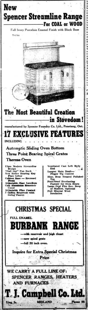 And finally, kitchen stoves are no longer manufactured in Canada, possibly not even in the U.S.A, but in 1937 you could buy this “Beautiful Creation” built in Penetanguishene.