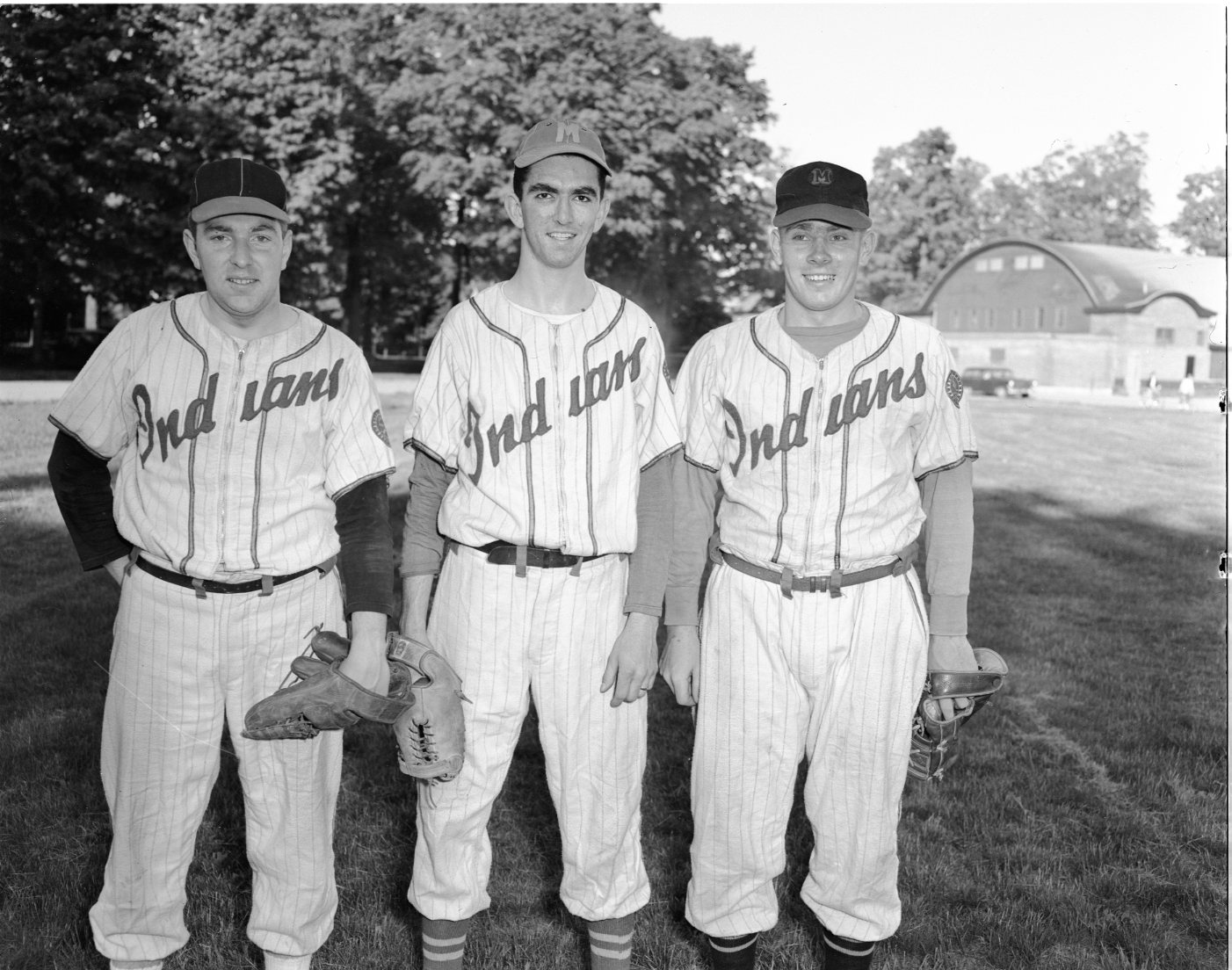 Despite their unexpected defeat at the hands of Alliston last week, Midland Indians are considered strong contenders for the South Simcoe Baseball League pennant this year. Three former Orillia players are now playing with Midland. Left to right are outfielders Dean Heliotis and Ken Hipwell, and catcher Court Braley.