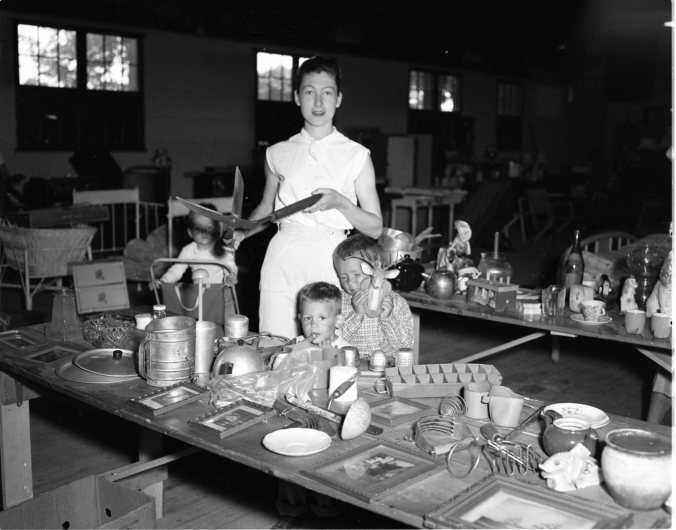 Everything from “soup to nuts” just about describes the articles donated to St. Mark’s Laymen’s Association for their auction sale at Midland Curling Club Saturday. Here Mrs. (Betty) Cliff Irvine tries out a pair of garden shears while her sons, Brian, 5, and Charles, 3, seem more interested in a miniature deer head.