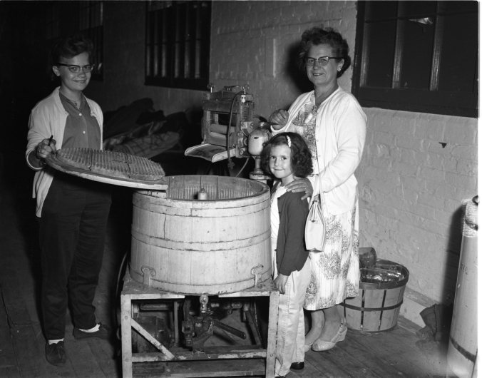 This ancient washing machine brought smiles from Mrs. M. Doucette and her daughters; Diana, 13, and Barbara, 6. It was one of the many articles donated to the Laymen’s Association of St. Mark’s Anglican Church for their auction sale at Midland Curling Club Saturday. The sale raised about $500 for the association’s “kitchen” and “needy family” projects.