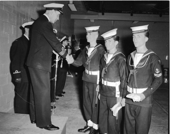 Top Cadets of RCSCC “Huron” are seen above receiving their awards from Commander G. J. Manson at the annual inspection last Wednesday night. Cadets are, left to right, A/B Kirk Mitchell, L/C Terry McIlravey, and L/C David McIlravey.