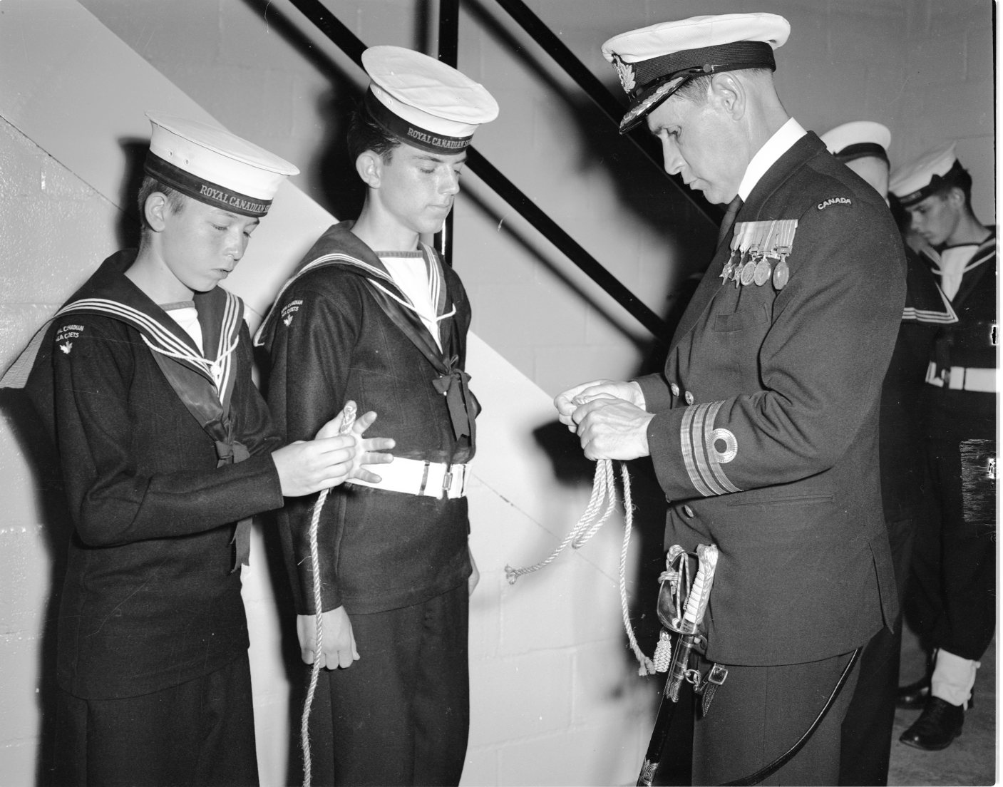 Another ancient art of the mariner is knot tying, a part of the training of all sea cadets. “Huron” cadets Gary Hood, left, and David Mcllravey show their proficiency to Commander G. J. Manson of Hamilton, during last Wednesday night’s annual inspection.
