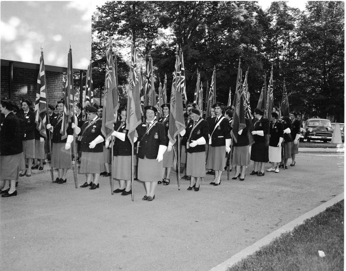 Massed flags of the colour parties from various branches of the Women’s Auxiliaries to the Canadian Legion provided a colourful touch to the parade and rally held in Midland Wednesday night. The Midland Women’s Auxiliary, Branch 80, played host to the visiting auxiliaries who arrived by car and chartered buses. The parade formed up at Midland Armory.