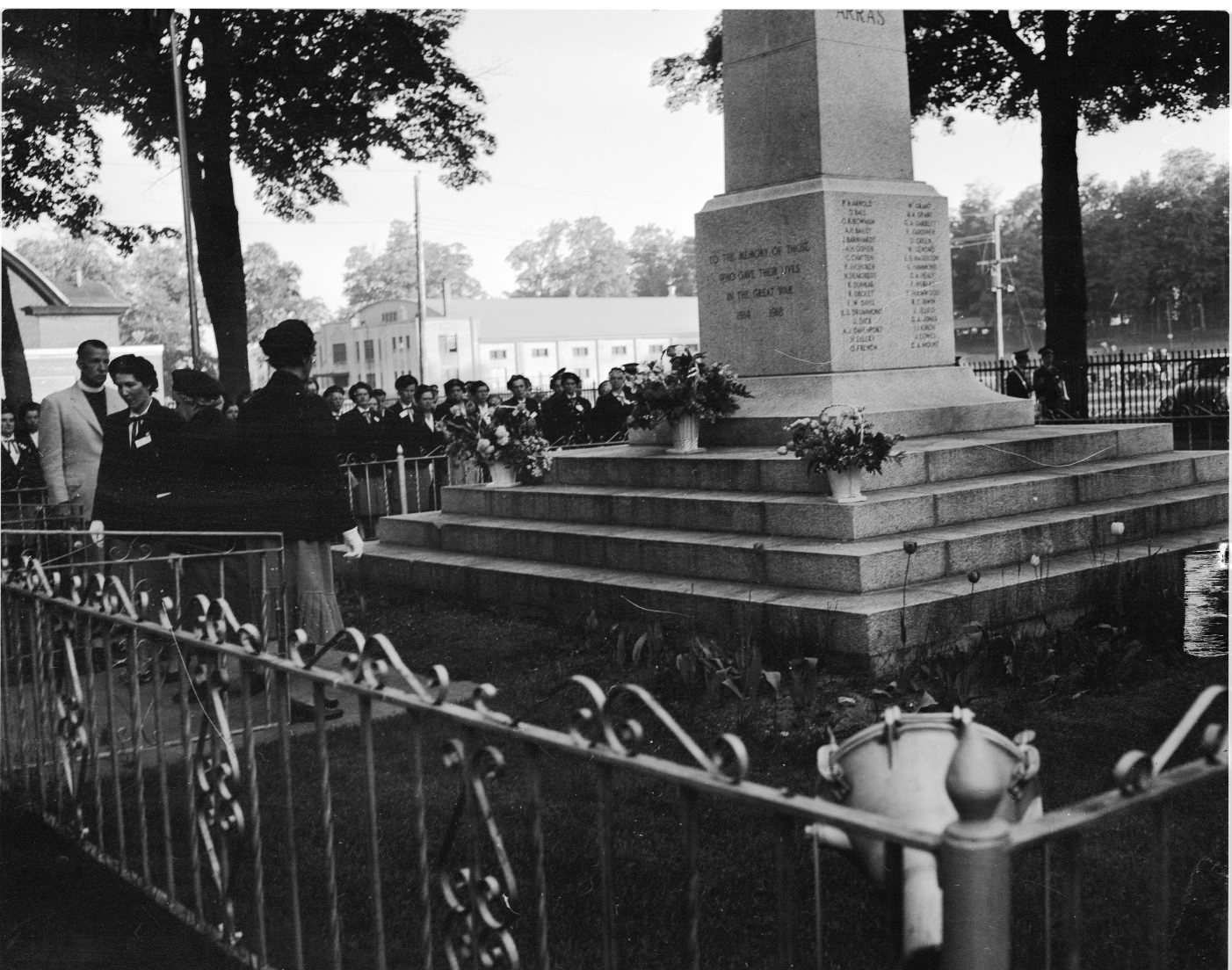 The laying of flowers on the cenotaph was an important part of the rally held by Zone E-4 Women’s Auxiliaries to the Canadian Legion here Wednesday night. Pictured left to right are Commander Mrs. Len Maheu, president of the Midland branch; Chairlady Florence Pegg, of the Ontario Provincial Council, Toronto, and Zone Commander V. Adams of Barrie.
